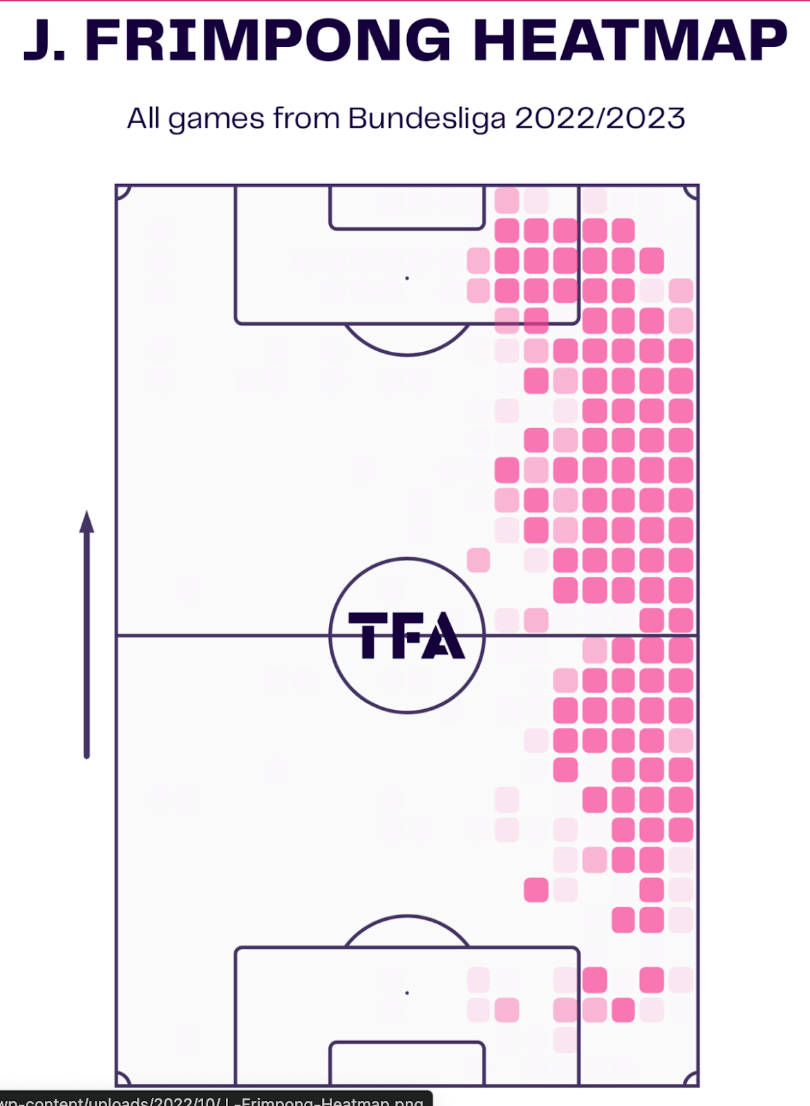 image: Jeremie Frimpong heat map for the 2022/23 season in The Bundasliga