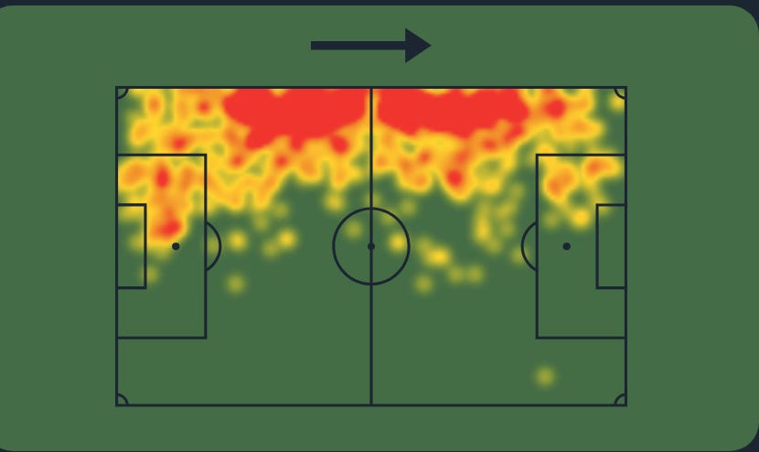 The idea is to have a fullback operate as an extra midfielder so that teams can pass the ball in a safer manner with shorter passes that retain more possession. This allows for an overload in the midfield, provides for counter-protection, and sets up a better formation for counter-pressing if the ball is given away in the opposing final third. This can be seen in a few great teams in world soccer, specifically in teams like Arsenal where Oleksander Zinchenko will routinely step into the midfield to isolate the winger in front of him by drawing the opposing winger to cover him. As you can see on his heat map below, more often than not he is receiving the ball in the half-space where one could expect a midfielder to receive it.