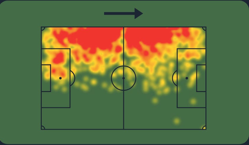 Obviously not all teams use their fullbacks this way. For example, under Xabi Alonso, Jeremie Frimpong has been tasked with receiving the ball in wider spaces in an effort to pin the opposition fullback high defensively, to generate 1v1 situations, situations which the Dutch fullback thrives in. This can only happen because Bayer Leverkusen does not play with traditional wingers. In fact Jonas Hofmann, based on his heat map, profiles more like an inside forward than a traditional winger. Frimpong is given even more freedom due to the defensive cover he has from the three center backs behind him. This allows him to find space on the outside and become increasingly more dangerous on the overlap. Frimpong was one of the most dangerous attacking players in the Bundesliga this season, all because he was able to find space in an attacking area that was given to him by the player in front of him.
